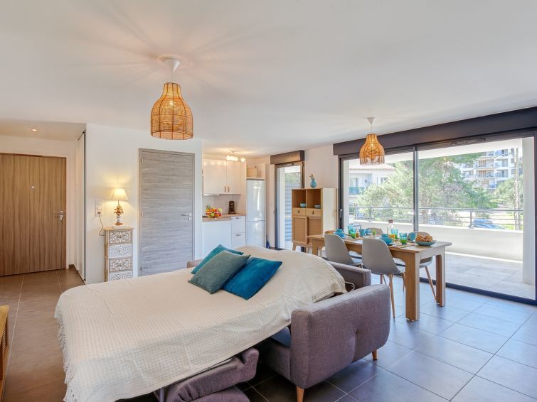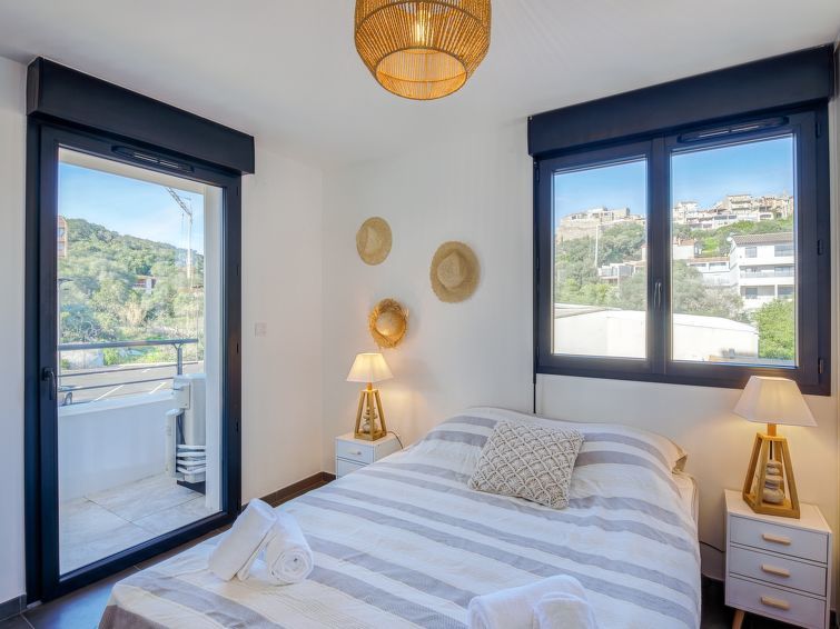 Appartement 2-kamers 51 m2 op de 1e verdieping. Zeer mooi en modern ingericht: woon-/eetkamer met 1 2-pers divanbed (140 cm, lengte 190 cm), TV (Flatscreen TV). Uitgang naar het terras. 1 kamer met 1 2-pers bed (140 cm, lengte 190 cm). Uitgang naar het terras. Open keuken (oven, 4 keramische glas kookplaten, broodrooster, waterkoker, magnetron, diepvriezer, elektrische koffiemachine). Uitgang naar het terras. Douche/WC. Elektrische verwarming, air-conditioning. Terras 21 m2. Terrasmeubelen, ligstoelen (2). Ter beschikking: wasmachine. Internet (WiFi, extra). Parkeerplaats. Niet rokers woning. Rookmelders. 2A247001463D5